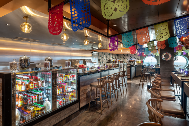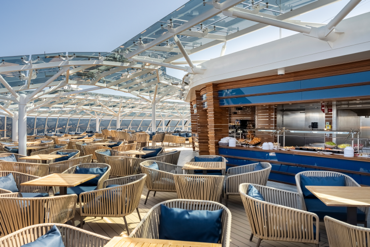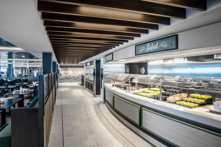 The Marketplace Buffet, located on Deck 15, is the primary casual dining venue and is open for breakfast, lunch, and dinner. It features multiple stations with identical offerings on both sides when fully open.