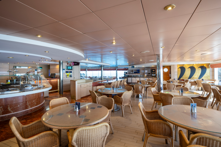 This lido deck venue offers quick service options during the day, focusing on burgers, pizza, pasta dishes, french fries, and snacks.