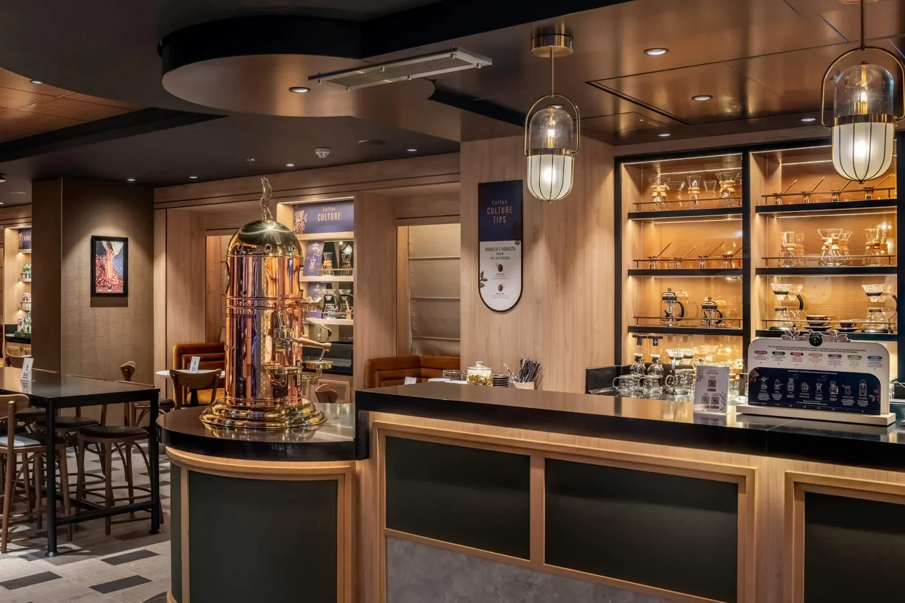 Coffee Emporium is the ship’s dedicated coffee bar, serving espresso drinks, slow brewed coffee, iced beverages, and coffee cocktails, along with snacks like pastries and sandwiches.