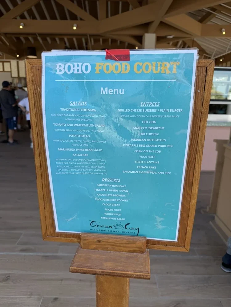 Boho Grill is a newer buffet location positioned closer to the center of the island. It serves the same menu as Seakers Grill but includes additional shaded seating on the sand. This makes it a convenient alternative during busy lunch periods, especially for guests seeking shade.
