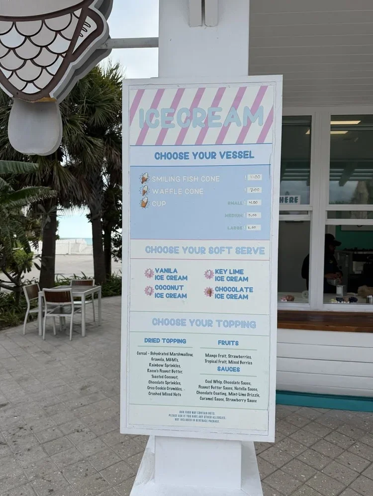 The menu focuses on espresso-based coffee drinks, iced coffee, and soft-serve ice cream. Guests can choose from several ice cream flavors along with different cones, cups, and toppings. The Smiling Fish functions as a convenient stop for specialty coffee or dessert while walking through the village, rather than a primary dining option on Ocean Cay.