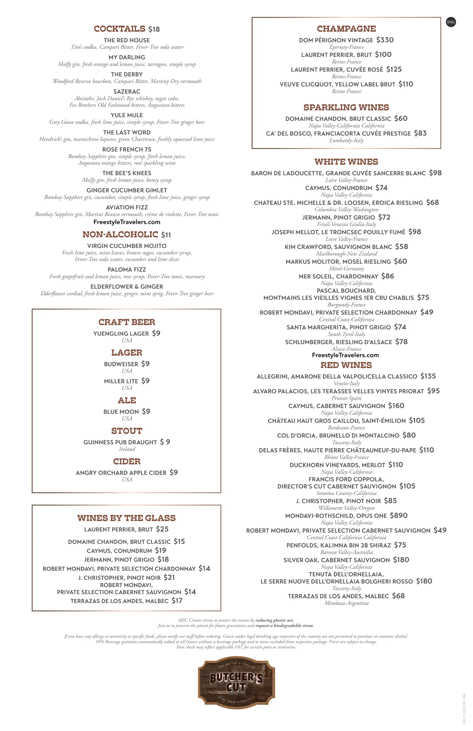 Butcher’s Cut offers an extensive drinks menu, including classic and modern cocktails, non-alcoholic beverages, craft beer, and a full wine list. Cocktails typically cost around $18, and wines are available by the glass or bottle. The wine selection includes top producers such as Caymus, Robert Mondavi, Jermann, Laurent Perrier, and Veuve Clicquot. MSC Cruises beverage package holders can generally use their packages at Butcher’s Cut within the package terms.