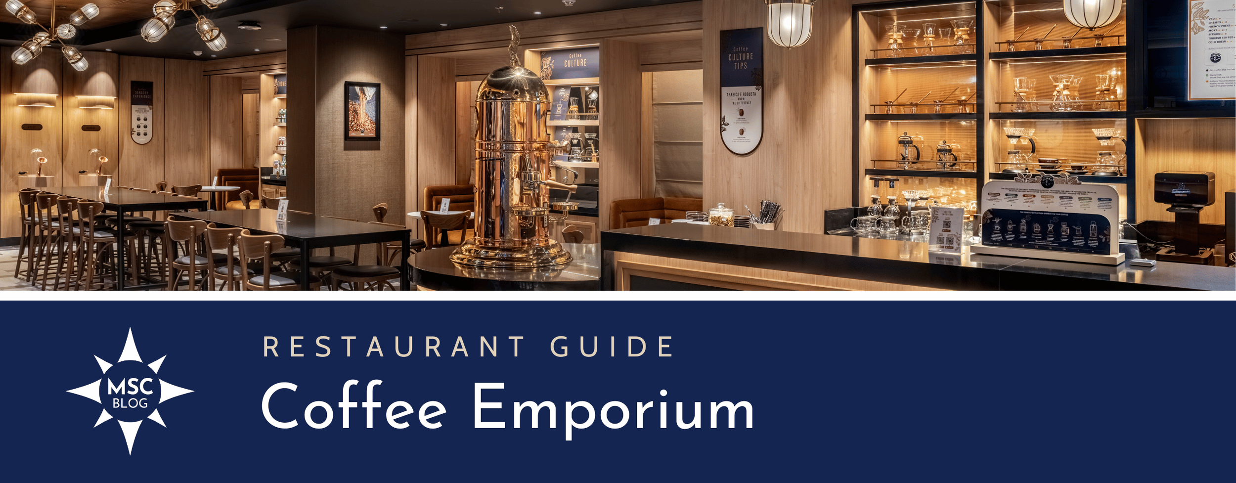 Coffee Emporium is the main dedicated coffee bar on select MSC Cruises ships, offering a full menu of espresso drinks, slow brewed coffee, iced beverages, and coffee cocktails. With most drinks included in beverage packages, a wide variety of brewing methods, and light food options available, it provides a convenient and professional café experience at sea.