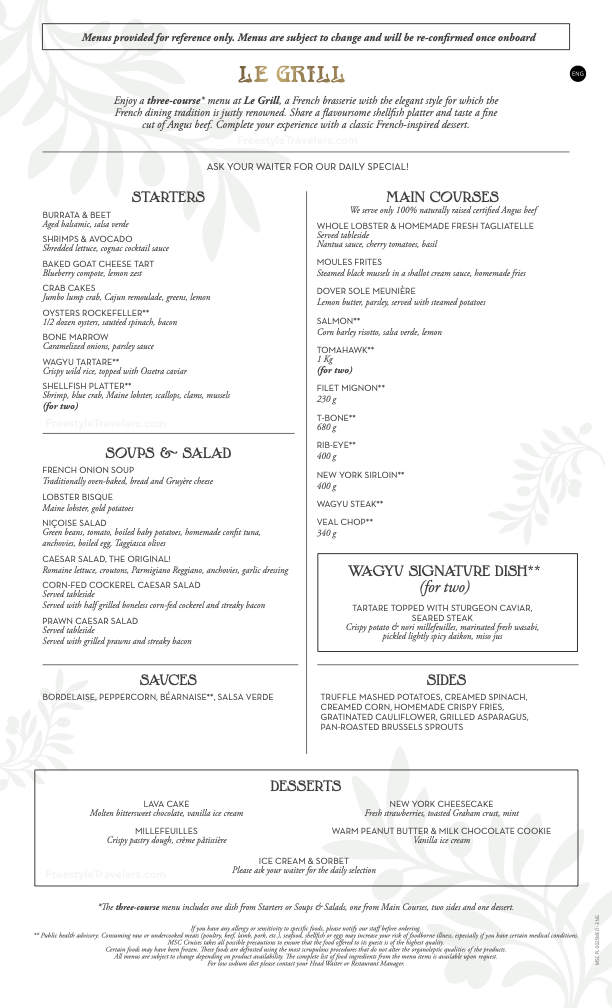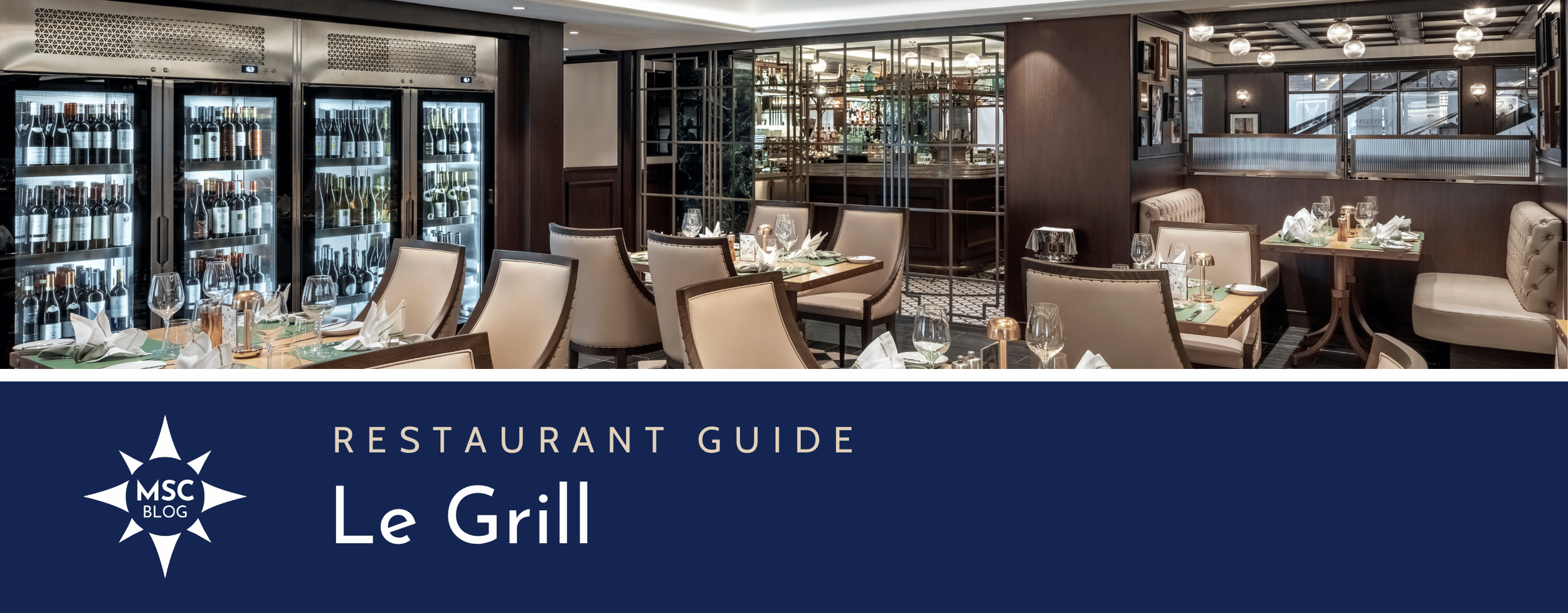 Le Grill is a specialty restaurant on MSC Cruises that brings the French Brasserie experience to the high seas. The menu emphasizes quality ingredients, including aged Linz heritage Black Angus beef, Maine lobster, Dover sole, and fresh shellfish. The restaurant is designed to offer a refined, elegant dining environment with attentive service and a three-course menu structure. Guests looking for authentic French brasserie fare, including seafood platters, steak options, and traditional soups and salads, will find Le Grill a standout option among MSC Cruises’ specialty restaurants.
